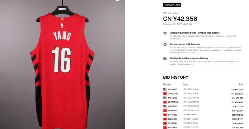 美媒SLAM分享动态:杨瀚森生涯第一次首发出战的球衣,已经在拍卖网站出售,最终以42356元人民币成交价出售完成。